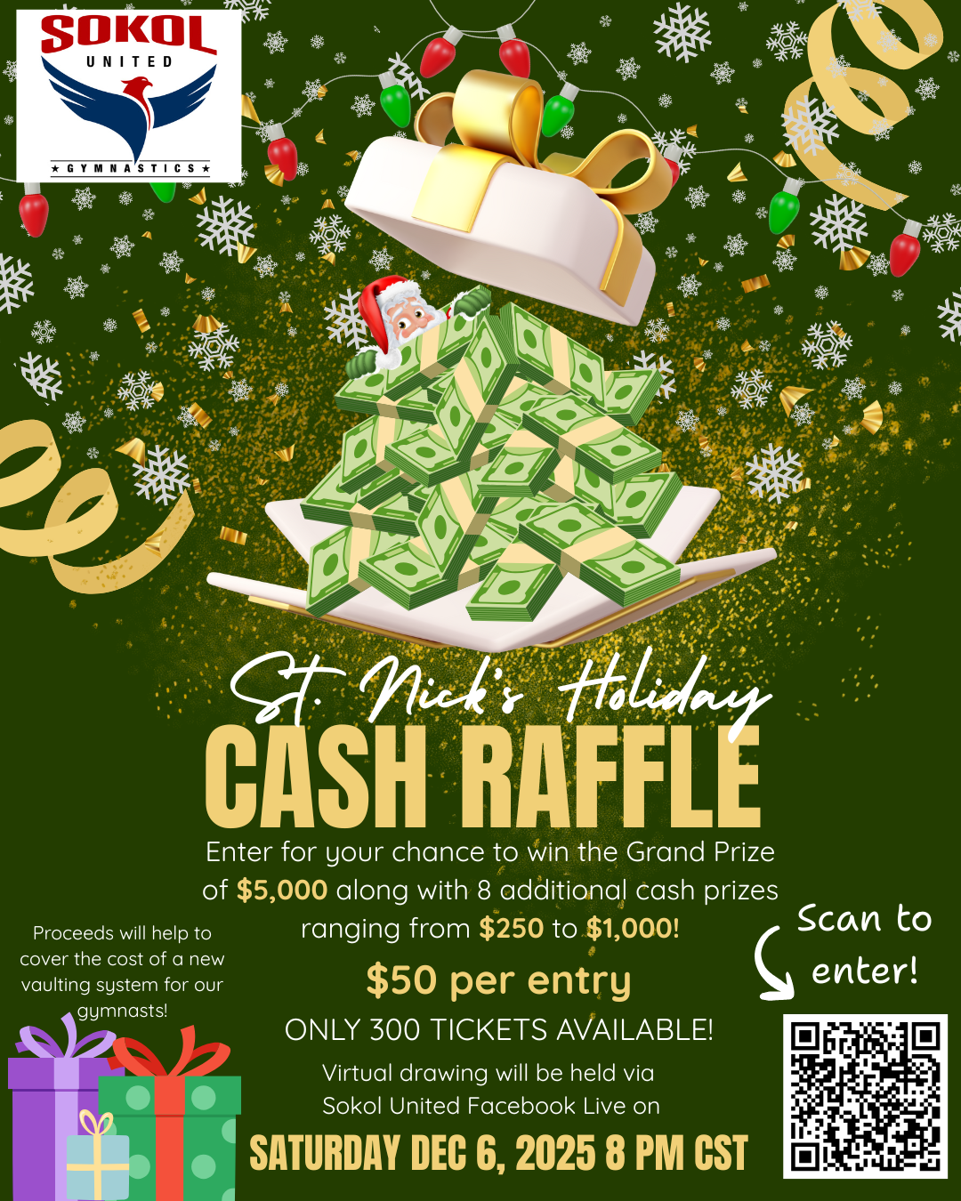 Sokol United is excited to announce our 2025 St. Nick’s virtual HOLIDAY CASH Raffle! $50 entry for your chance at 9 CASH prizes. Buy your tickets today – only 300 chances available!